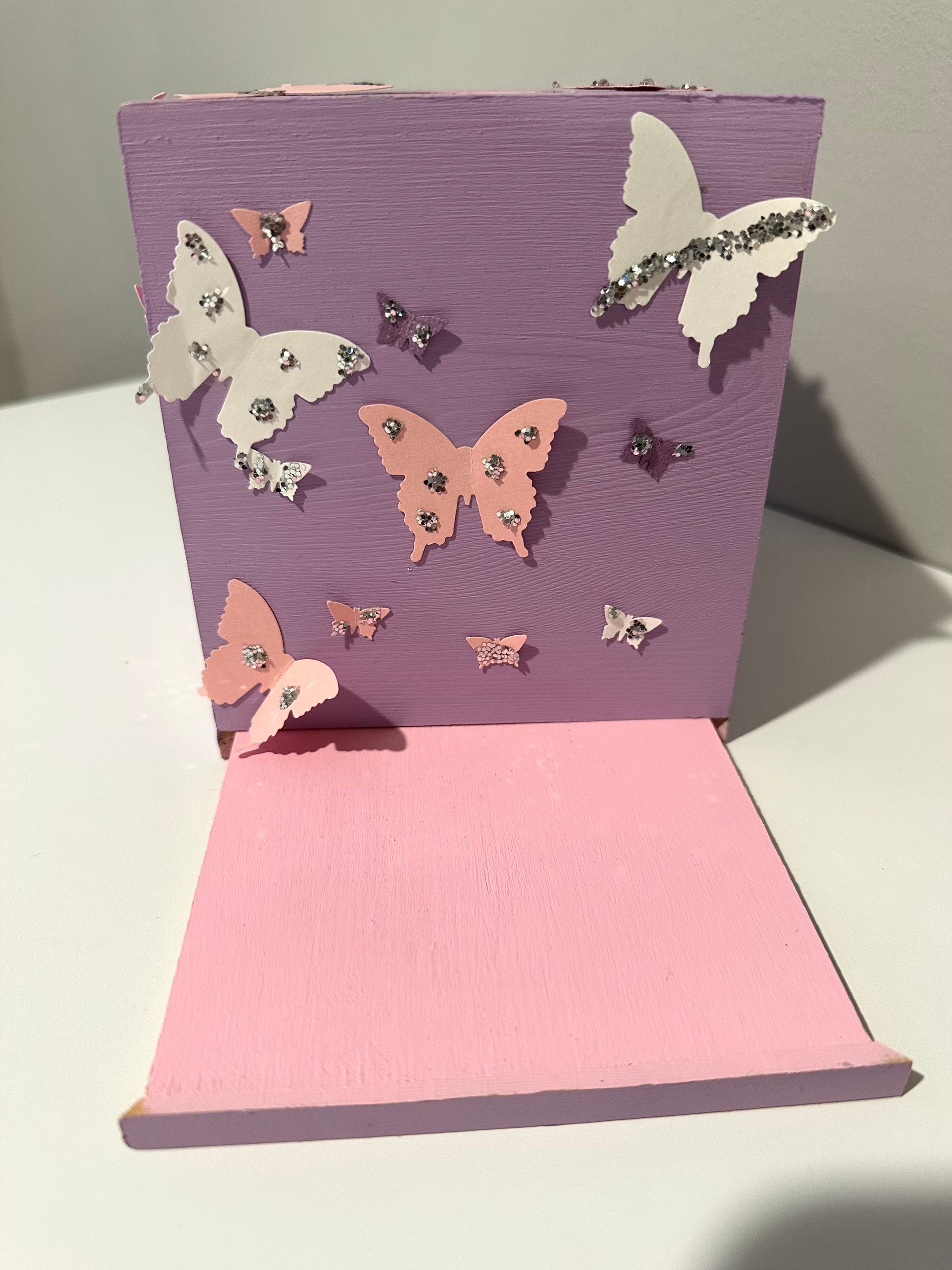 Adorable purple, pink and white butterfly tissue box, perfect for butterfly lovers, nursery, color specific or themed spaces. Tissue is inserted by removing the bottom. Color will vary based on display.
